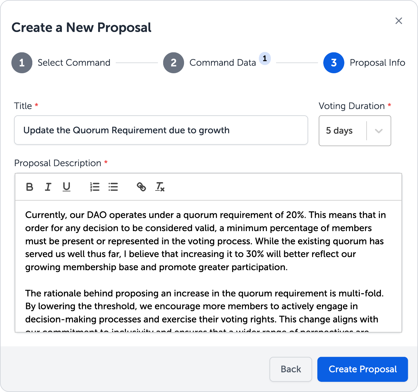 The last step of your proposal will require written details about your proposal. You will need to select a title, a short but descriptive title of your proposal. Write a detailed proposal description (make sure to be very clear on what you are proposing that needs to be changed and why you think it is a good idea.) And lastly you will need to set a voting duration.