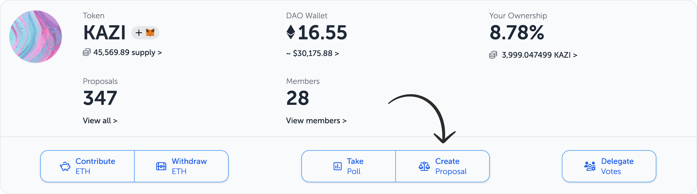 The easiest way to create a proposal, is using the "Create Proposal" button in the home page of your DAO: