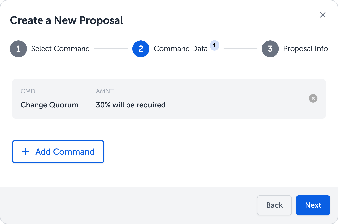 Each command requires a different set of inputs. Depending on the command type, this may be a wallet address (if you are sending ETH) or a quorum percentage (if you are updating quorum requirements). For more details on the input required on each command, please refer to this page.