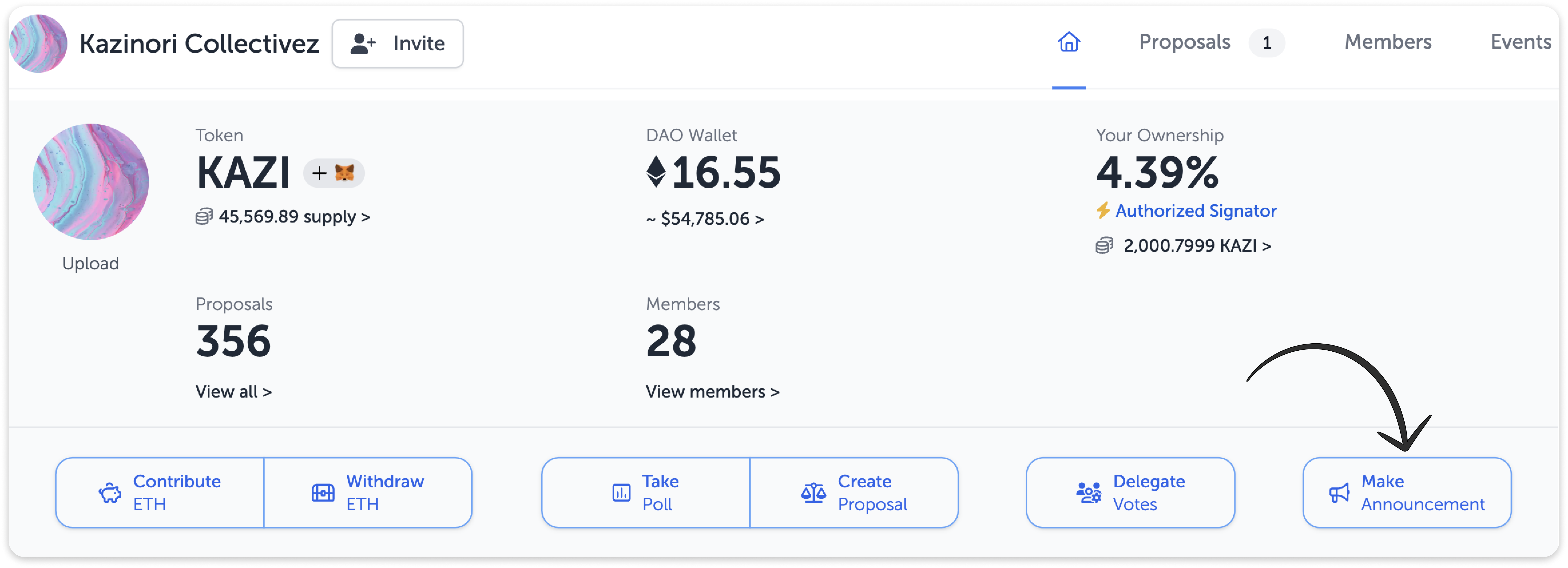 Announcements can be created by clicking the "Make Announcement" button from the main page of the DAO.