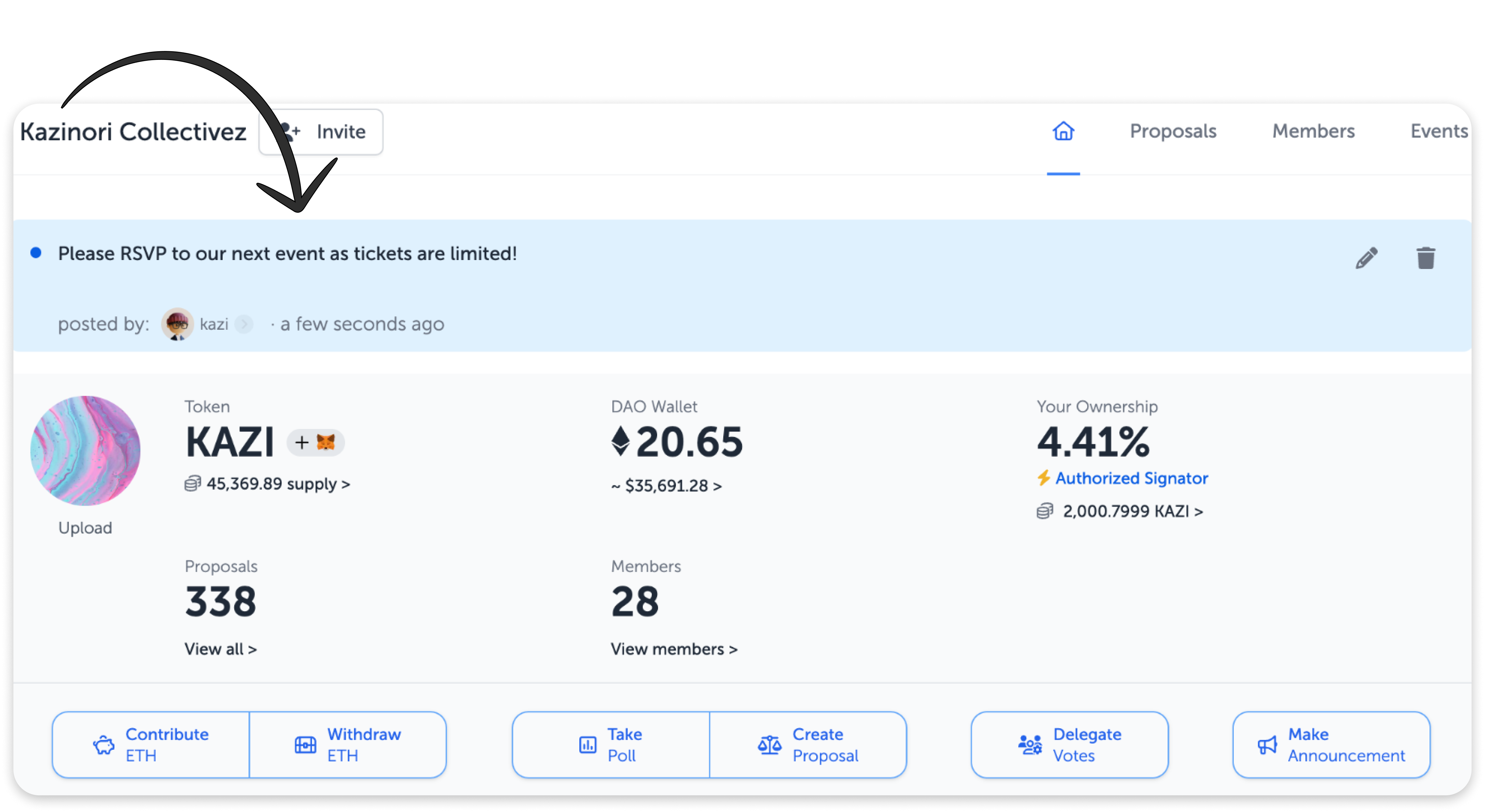 Sharing critical information: Announcements provide a direct and efficient way for Signators to communicate vital updates, news, and announcements to all members of the DAO. By pinning the announcements to the top of the main page, they ensure that the information is immediately visible to anyone accessing the DAO. This increases member engagement, encourages active participation, and fosters a sense of community.